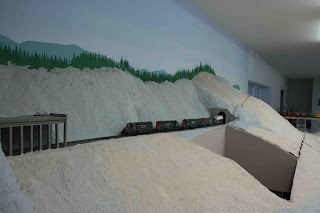 Our point helper set emerges from Tunnel 20 as it climbs toward Wicopee. A train waits on the mainline above at Cruzatte.