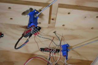 Blue Point switch machines mounted under the layout. The closer one (top) was the problem machine. Close inspection of this photo shows the throw rod is rubbing against the uneven edge of the slot cut into the plywood sub-roadbed.